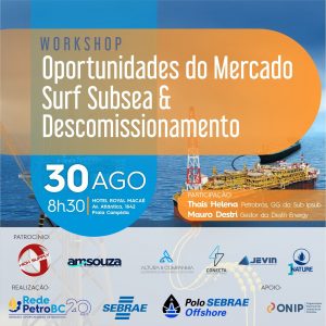 A REDE PETRO-BC, O SEBRAE-RJ e POLO SEBRAE OFFSHORE, com apoio da ONIP, convidam para o workshop com a participação especial da Sra. Thais Helena, GG da Sub ipsub da Petrobras e Sr Mauro Destri, especialista em descomissionamento que irão trazer quais os principais desafios, as perspectivas e as oportunidades deste mercado. ...